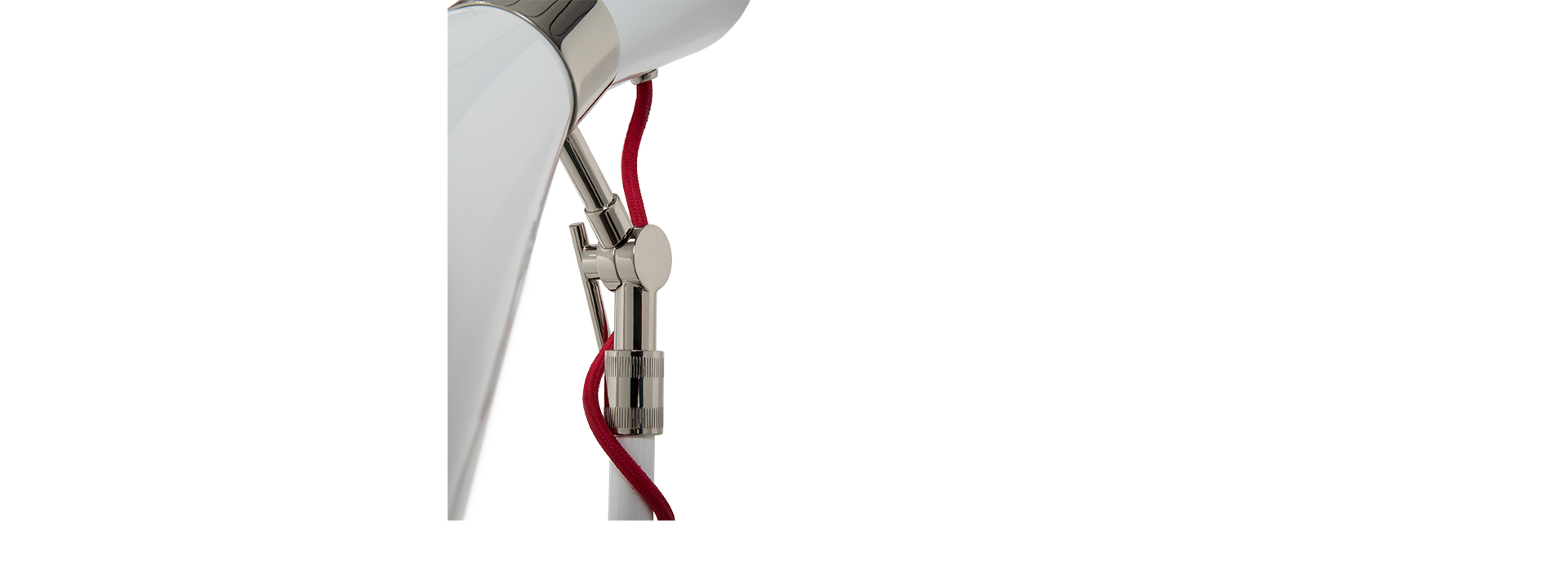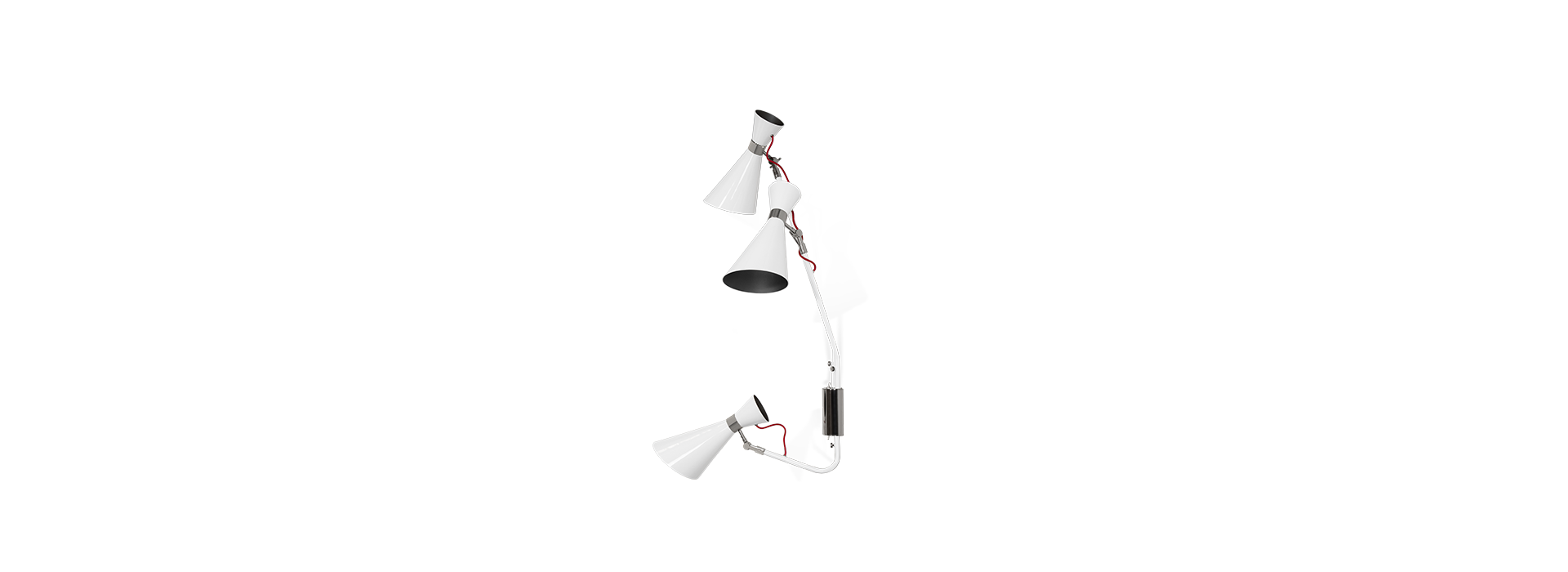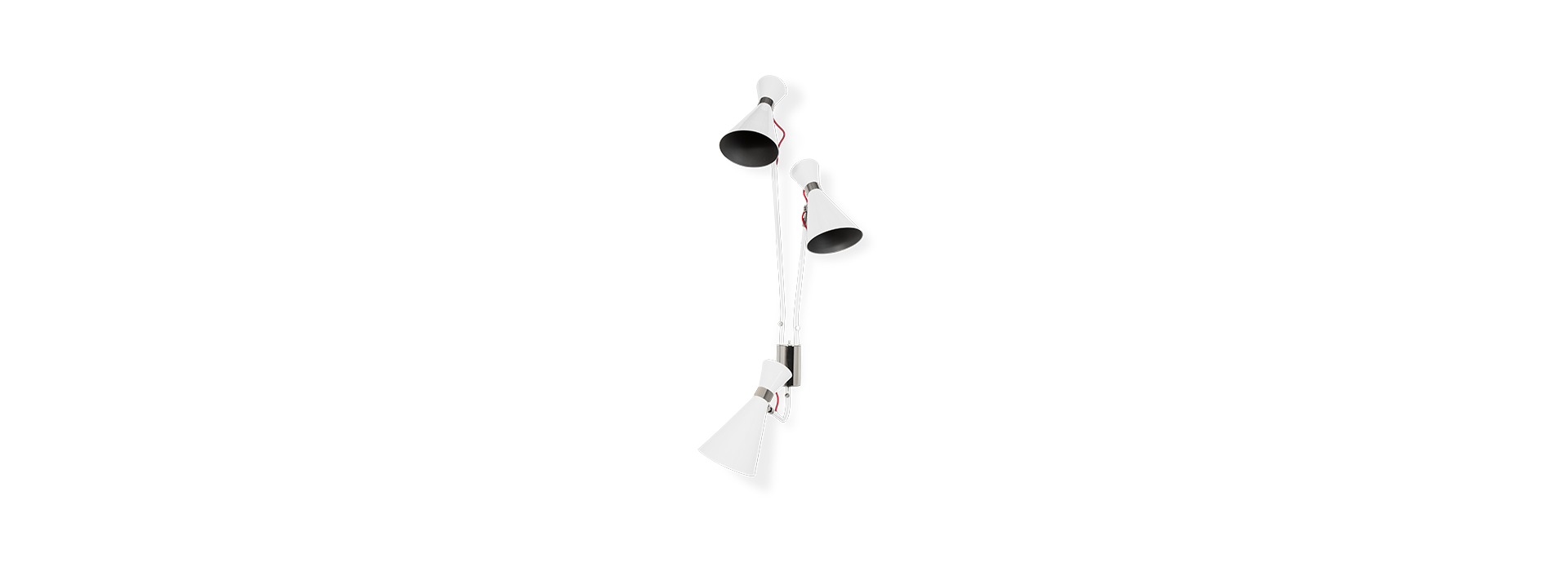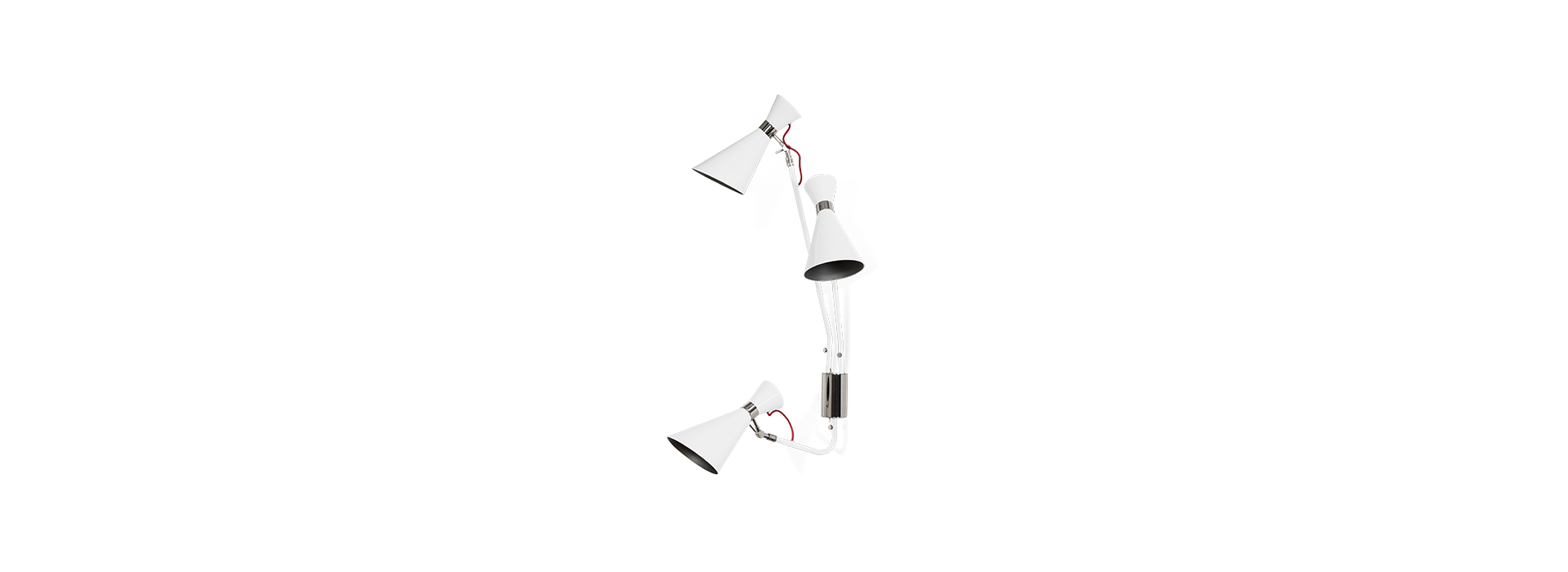 Simone wall lamp has a sleek, utilitarian design that brings a vintage flair to mid-century modern interiors. With a glossy white shade and a textile red wire, the vintage wall light fits in with a wide array of color schemes and styles. The three fully flexible arms are made of aluminum and the structure in brass, boasting three cone lampshades with gold plated accents. This mid-century modern sconce is easily changeable when in need of a reading light, especially as a bedside lamp, or if you are simply looking to light up your hallway.